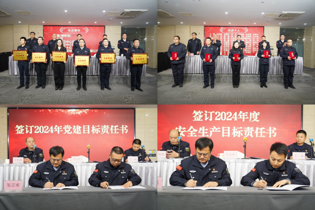 會(huì)上宣讀了《關(guān)于表彰2023年度先進(jìn)集體和先進(jìn)個(gè)人的通報(bào)》和《關(guān)于表彰2023年度優(yōu)秀共產(chǎn)黨員、優(yōu)秀黨務(wù)工作者和先進(jìn)黨支部的通報(bào)》。公司領(lǐng)導(dǎo)為獲得表彰的集體和個(gè)人代表頒獎(jiǎng),并與相關(guān)人員簽訂2024年度黨建目標(biāo)責(zé)任書、安全生產(chǎn)目標(biāo)責(zé)任書、持槍人員規(guī)范用槍承諾書黨風(fēng)廉政建設(shè)目標(biāo)責(zé)任書。